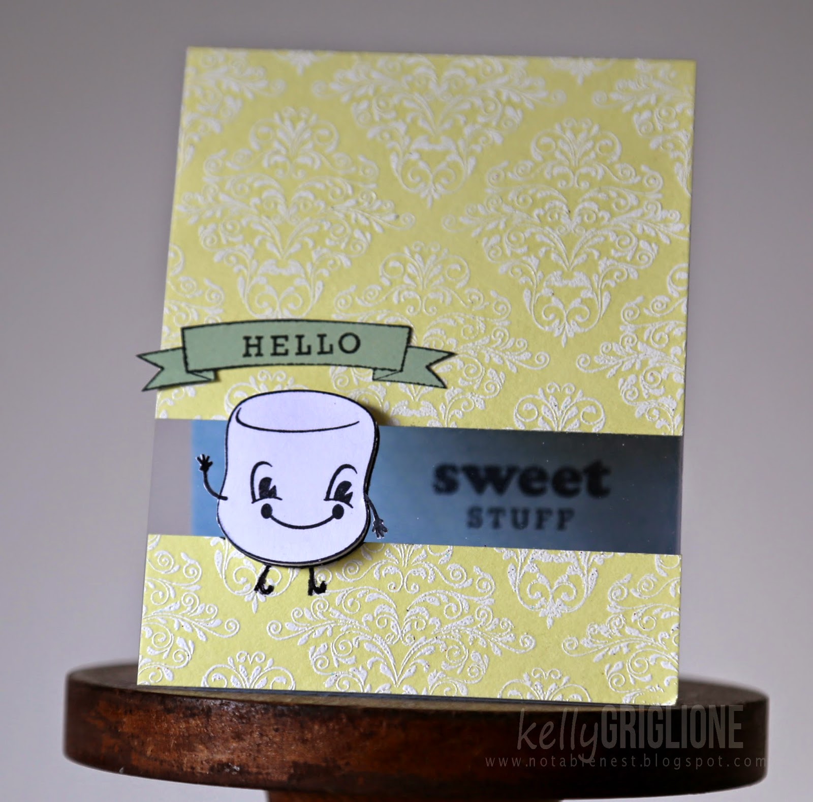 Hi Folks! Welcome to another fun Fusion Challenge! Love the buttery color in the inspiration photo, so this card has a ton of it. Plus a smiling marshmallow. Seriously, how can you not be happy with a smiling marshmallow?! It's from Cosmo Cricket S'more Love. The marshmallow is popped out from the card with those tiny arms and fingers cut out (in hindsight I should have just stamped the arms on the bottom layer). I embossed the Amuse Haunted Mansion background stamp (from the Stamping Royalty prize package) in white, and then used green for the "hello" banner (a modified Fiskars stamp also from SR) and blue for the inside of the card. All three colors in the photo.